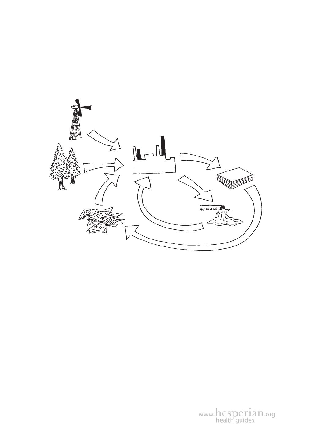 A paper factory uses trees, water, electricity, and chemicals such as chlorine.